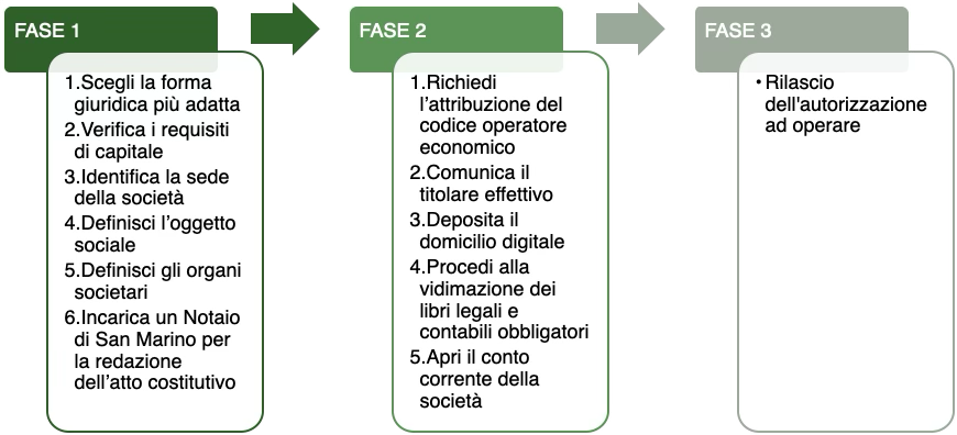 Ogni società deve avere sede legale a San Marino, al fine di ricevere notifiche e comunicazioni; per poter operare, inoltre, la Società deve avere a San Marino la disponibilità di una sede operativa idonea alla specifica attività che si intende svolgere.